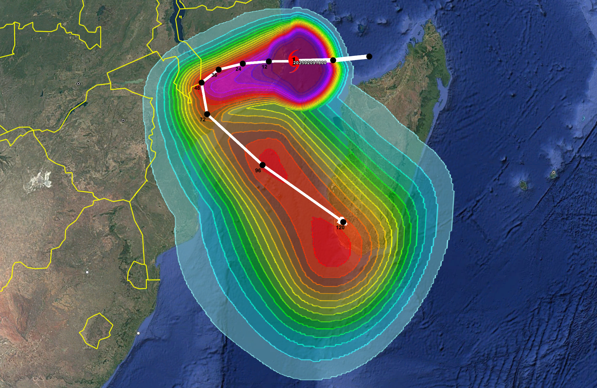 Rainfall associated with tropical cyclones can often have more devastating consequences compared to the damage from high winds. Our rainfall footprints show the past and forecast storm track from regional advisories, overlayed with rainfall accumulations over 12, 24, 36, 48, 72, 96, and 120-hour intervals so users can highlight areas at risk of floods, landslides, or mudslides. Data updates every 3-6 hours. |